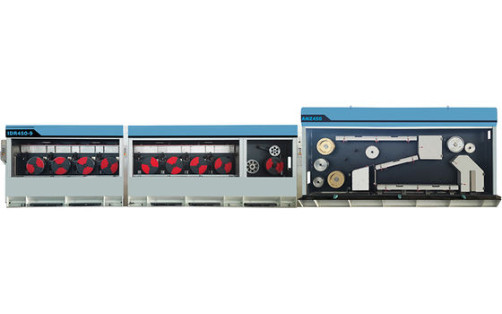 Эта машина используется для натяжения медных проводов Φ1,2-Φ3,5 мм. Натяжные блоки устанавливаются в один ряд. Колесо постоянной скорости и остальные 12 натяжных блоков приводятся в движение соответственно двумя двигателями.Такой дизайн позволяет легко работать и быстро меняться.